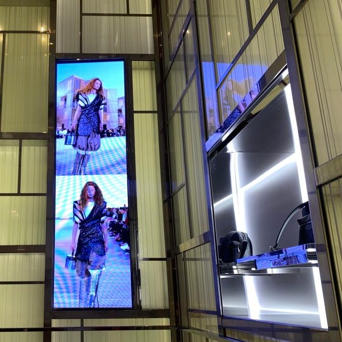 Totems et colonnes vidéo s’intègrent avec élégance aux espaces de vente pour créer une expérience visuelle immersive et maîtrisée.
